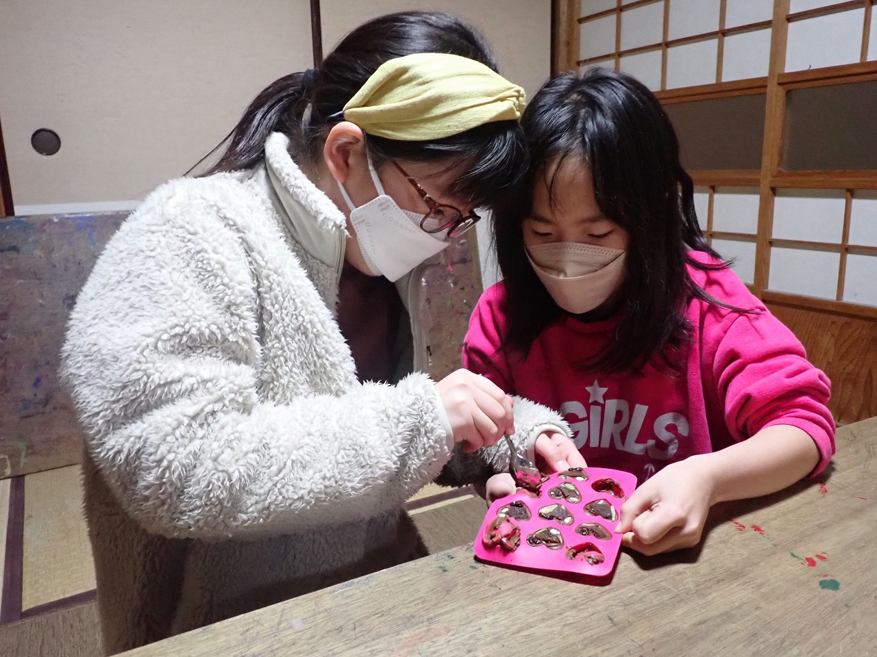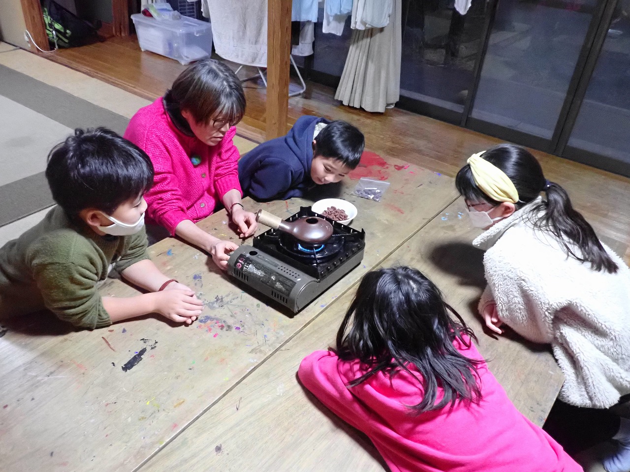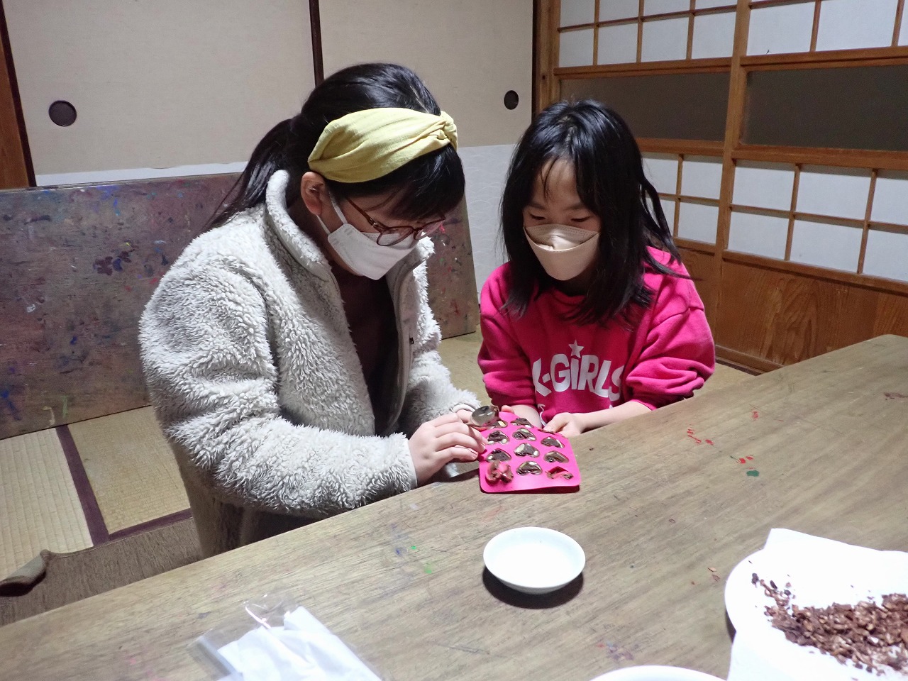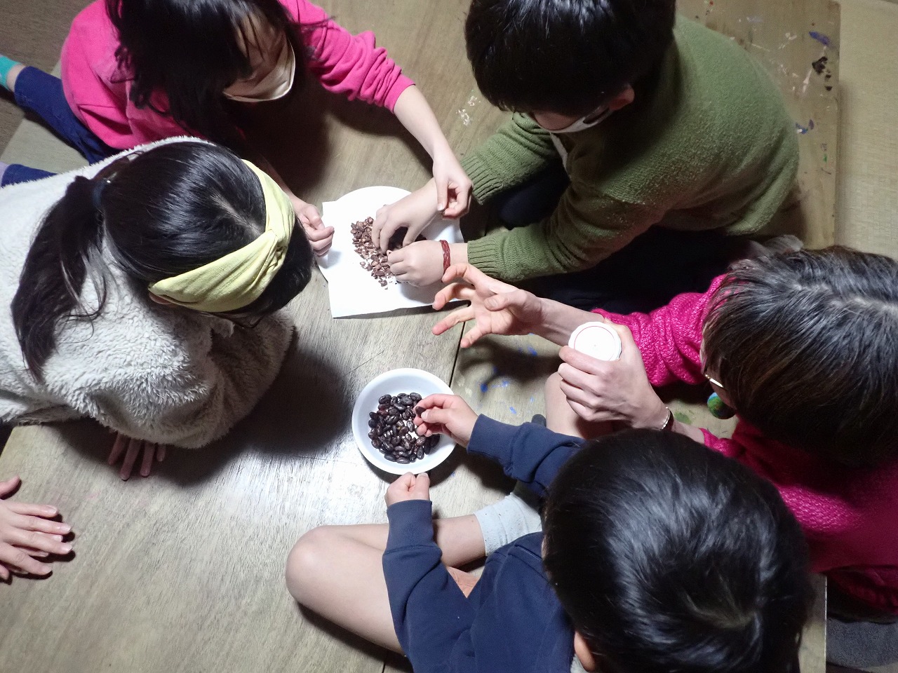 煎りたてのカカオ豆は、砂糖なしのチョコレートの味ですが、「苦い!」「美味しい!」と交互に言いながら、次々と手を伸ばしてきます。デーツに「本物のチョコレート」をまとわせたものや、そのチョコに杏子やナッツを入れた小さなハート型のチョコも、みんなとっても氣に入ってくれた様子。