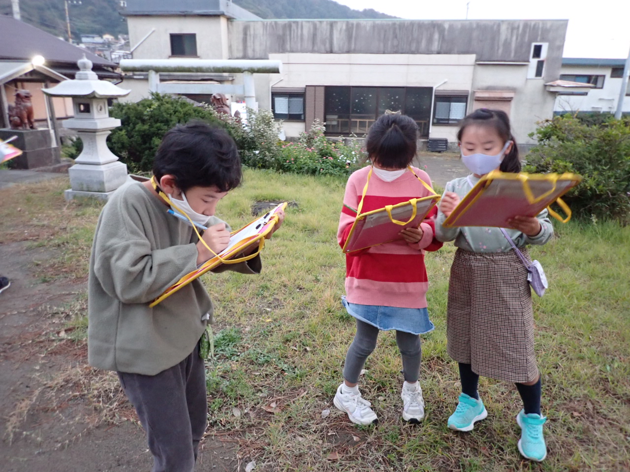 道中、神社、砂浜でそれぞれが身の回りで聞こえる音を探していました。
