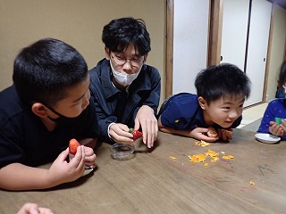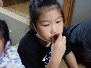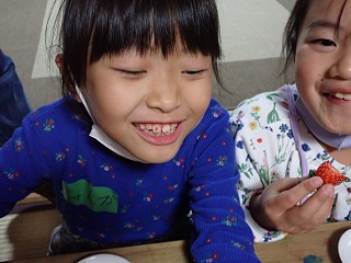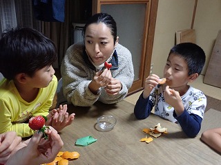今回は果物をじっくりと味わって食べるという経験をしてみて、その経験がどんなものだったかを言葉にするということをやりました。 果物を食べるという行為は同じでも、絵の描き方や言葉の選び方、説明の仕方が子供たちによって全然ちがうのが面白かったです。まずイチゴの絵を紙全体に描いた後で味や食感を書き足している子もいれば、ミカンの皮を剥いてから食べ終わるまでの一連の流れを順番に説明するように書いている子もいました。さらには、イチゴの表面あたり?をレタスの味に似ていると表現した子もいました。 そして子供たち、特に僕が隣で見ていた男の子たちは周りの様子をあまり見ずに、スラスラと自分の思うままに書き進めているように見えました。その結果が、十人十色の表現に繋がったのかもしれません。 僕が高校生の頃を振り返ってみると、自分が何を描きたいと思うのか、よりも周りからどう見られるかということを強く意識していたように思います。だからこそ、紙を前にしてすぐに作業に取り掛かる子供たちの勢いが、新鮮に見えました。