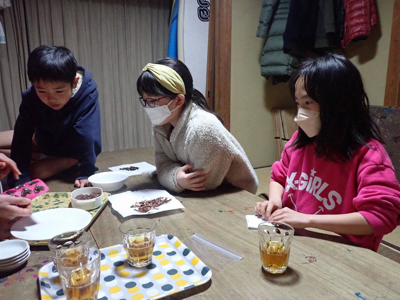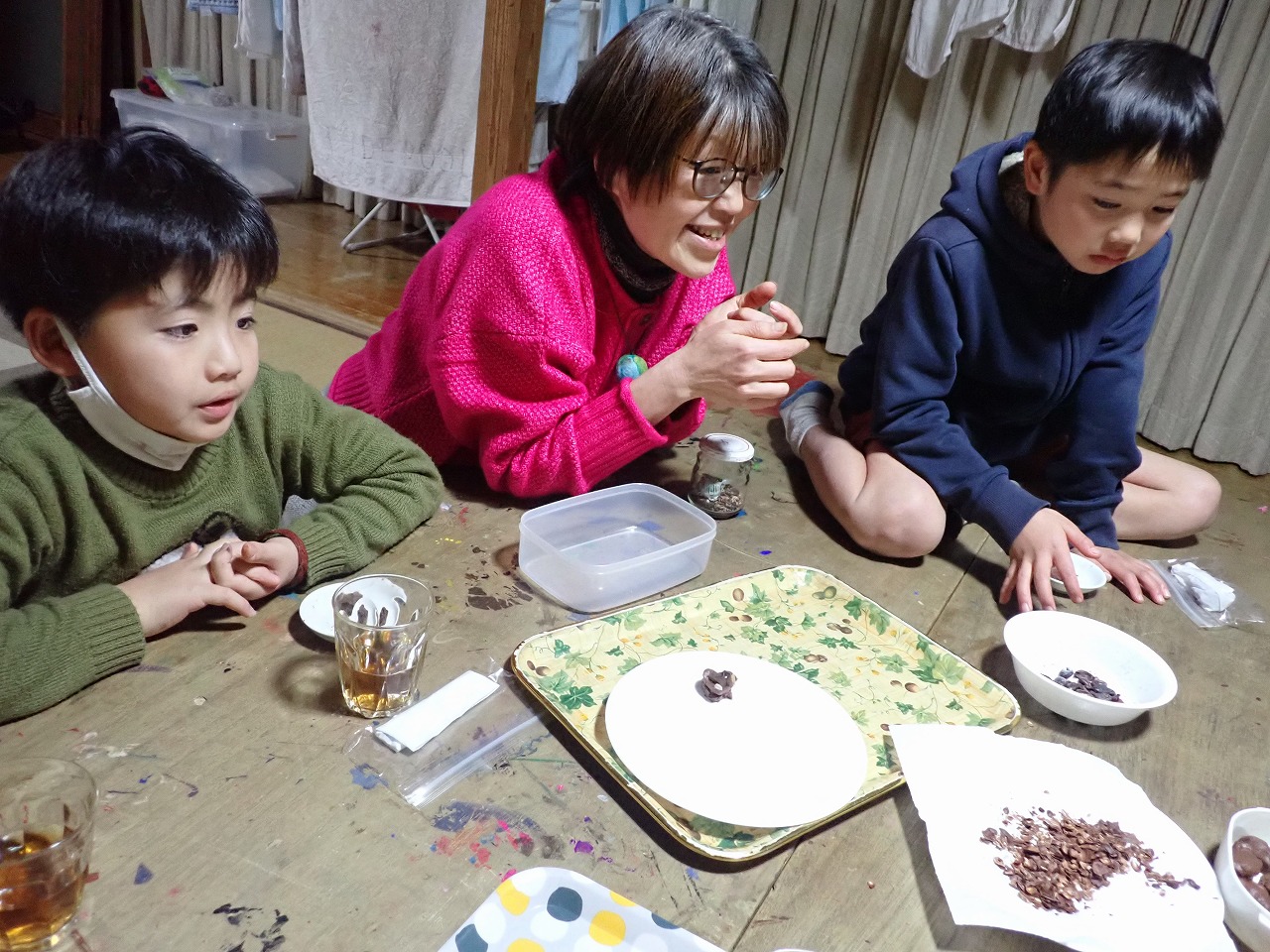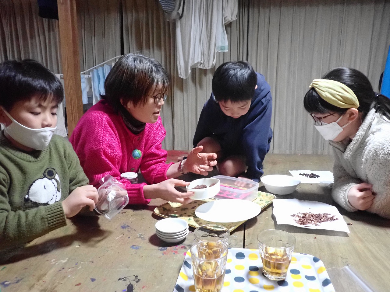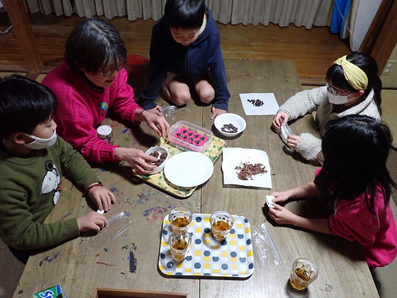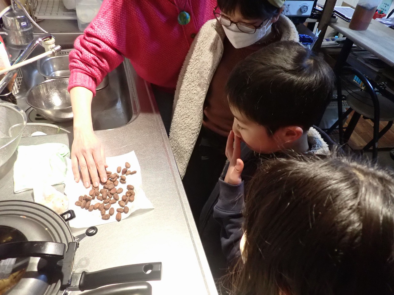 煎りたてのカカオ豆は、砂糖なしのチョコレートの味ですが、「苦い!」「美味しい!」と交互に言いながら、次々と手を伸ばしてきます。デーツに「本物のチョコレート」をまとわせたものや、そのチョコに杏子やナッツを入れた小さなハート型のチョコも、みんなとっても氣に入ってくれた様子。