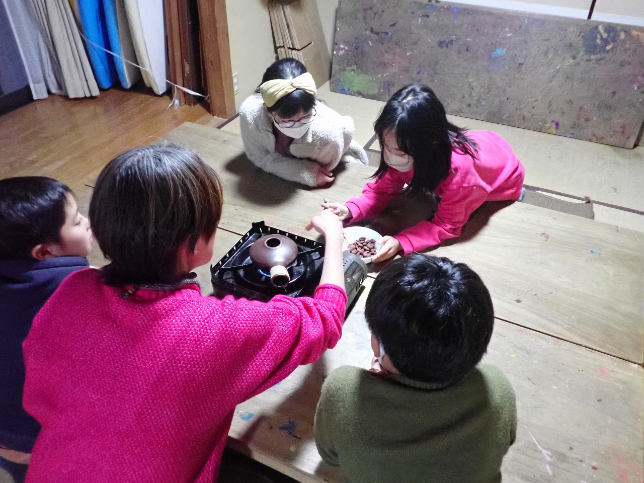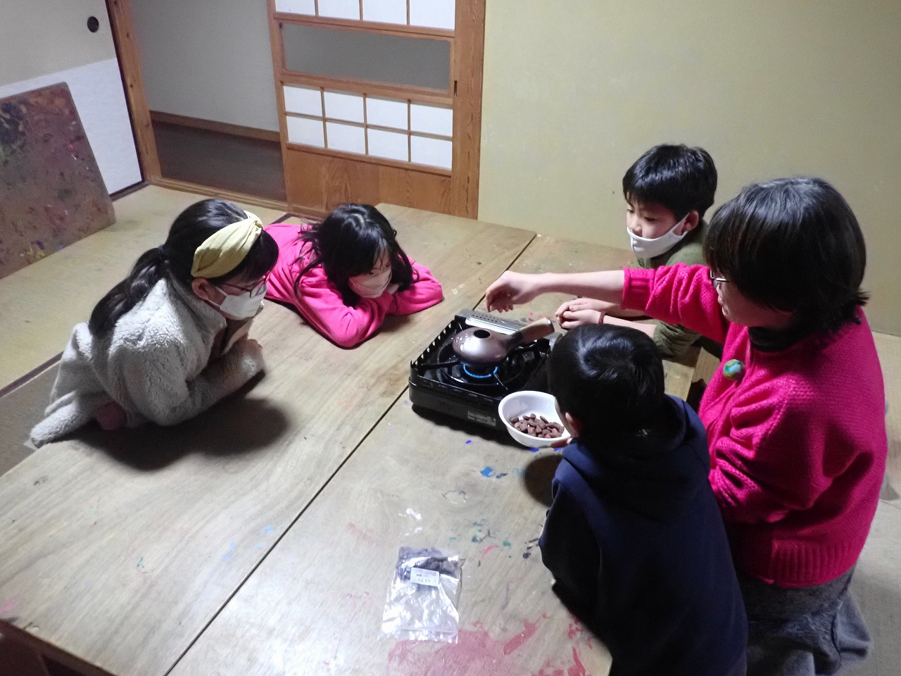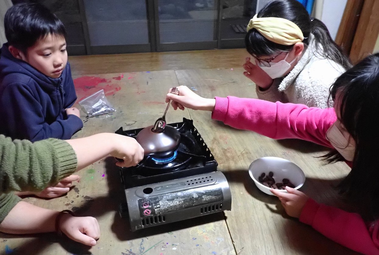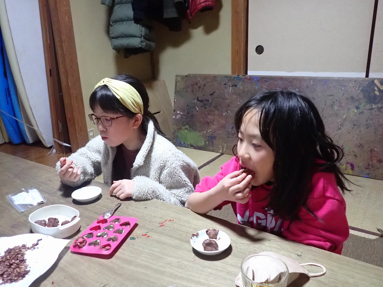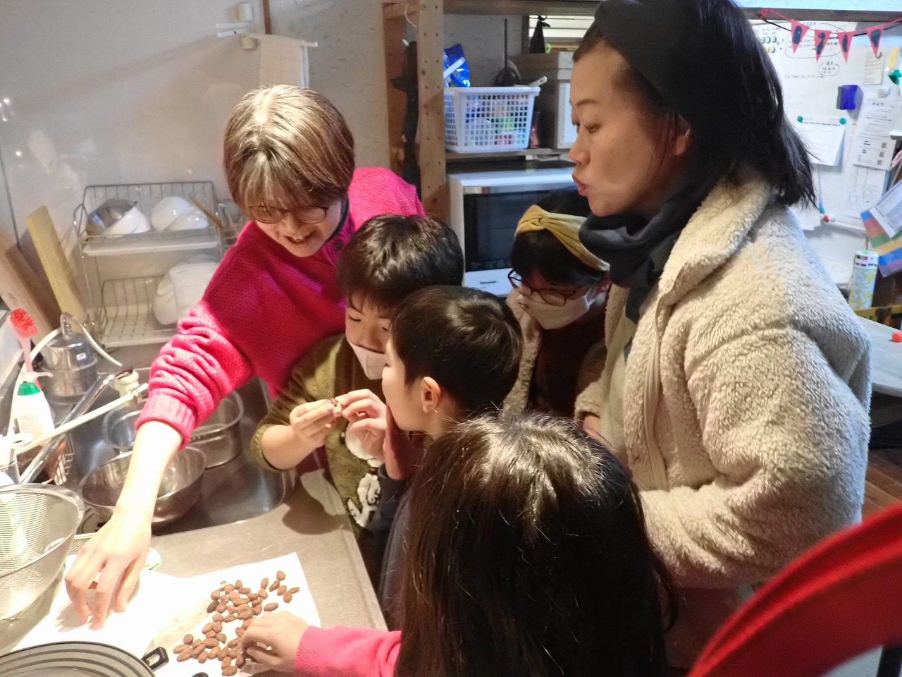 煎りたてのカカオ豆は、砂糖なしのチョコレートの味ですが、「苦い!」「美味しい!」と交互に言いながら、次々と手を伸ばしてきます。デーツに「本物のチョコレート」をまとわせたものや、そのチョコに杏子やナッツを入れた小さなハート型のチョコも、みんなとっても氣に入ってくれた様子。