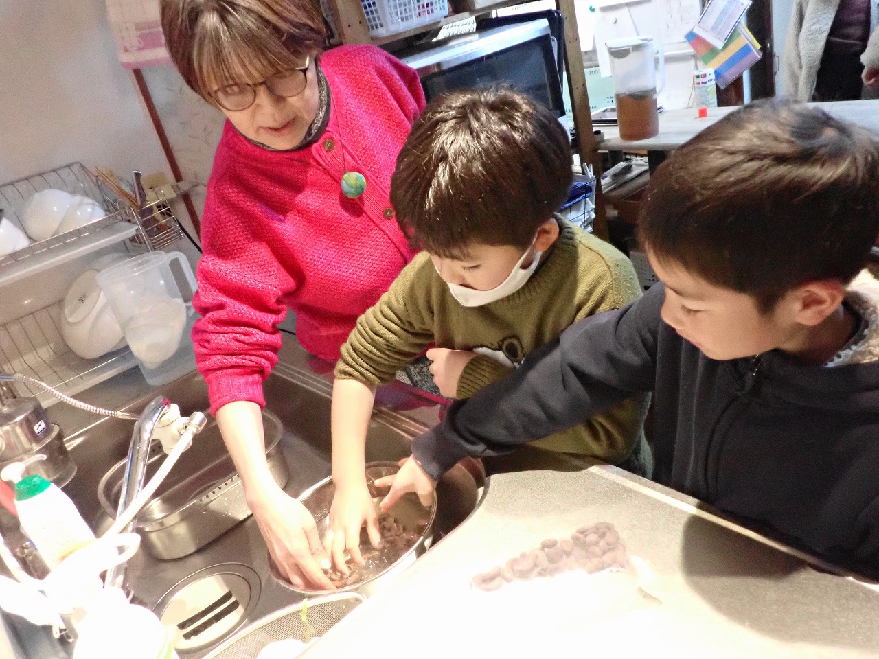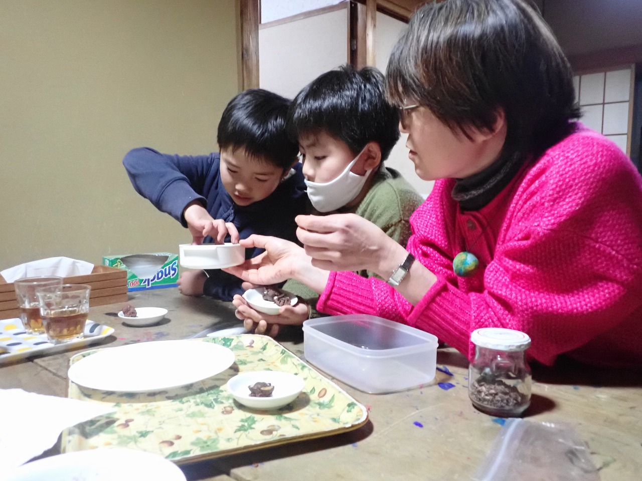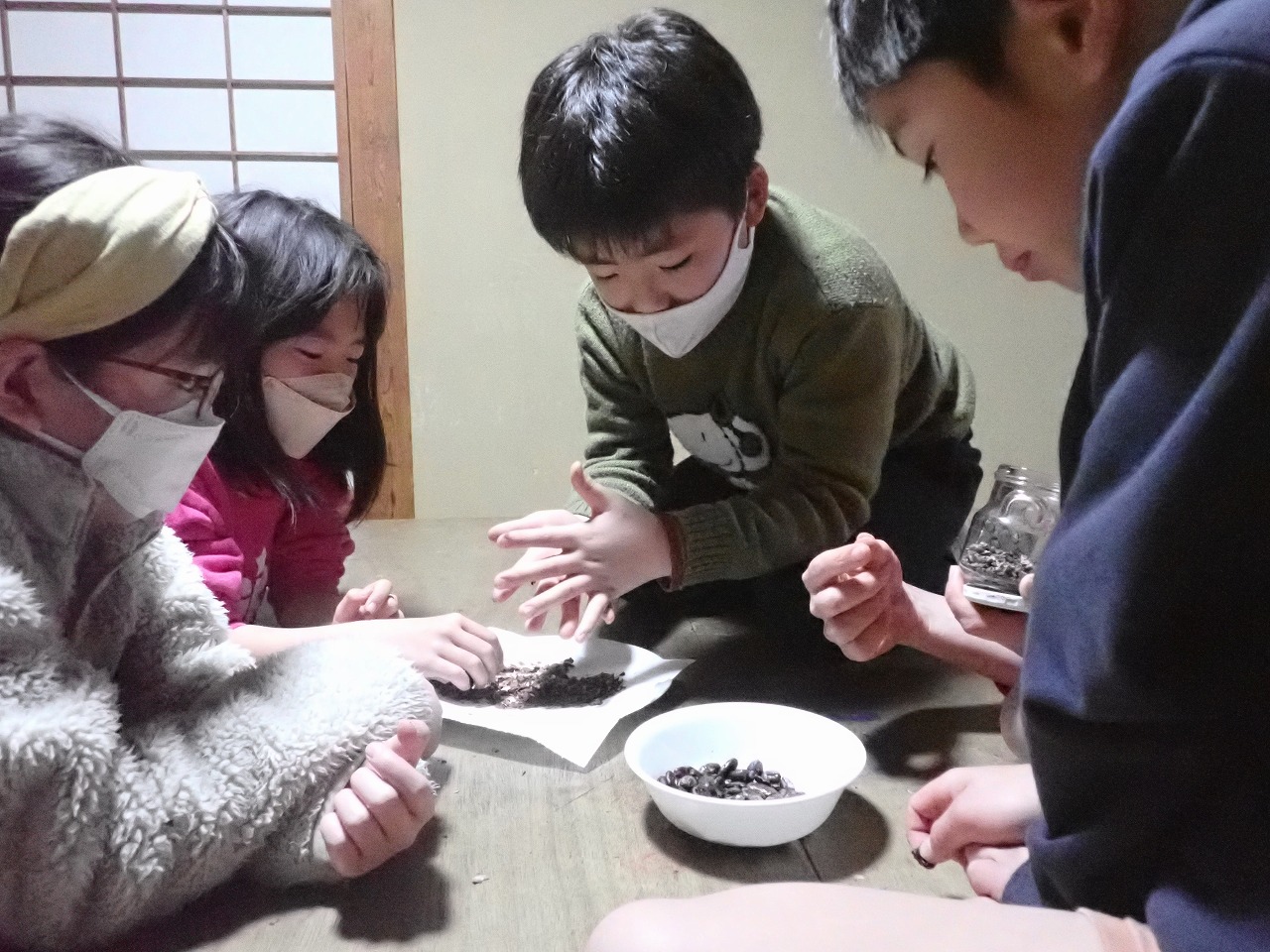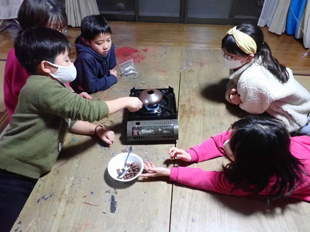 煎りたてのカカオ豆は、砂糖なしのチョコレートの味ですが、「苦い!」「美味しい!」と交互に言いながら、次々と手を伸ばしてきます。デーツに「本物のチョコレート」をまとわせたものや、そのチョコに杏子やナッツを入れた小さなハート型のチョコも、みんなとっても氣に入ってくれた様子。