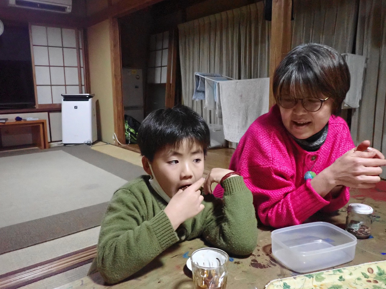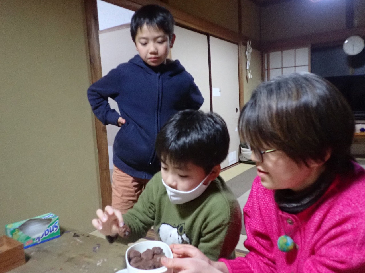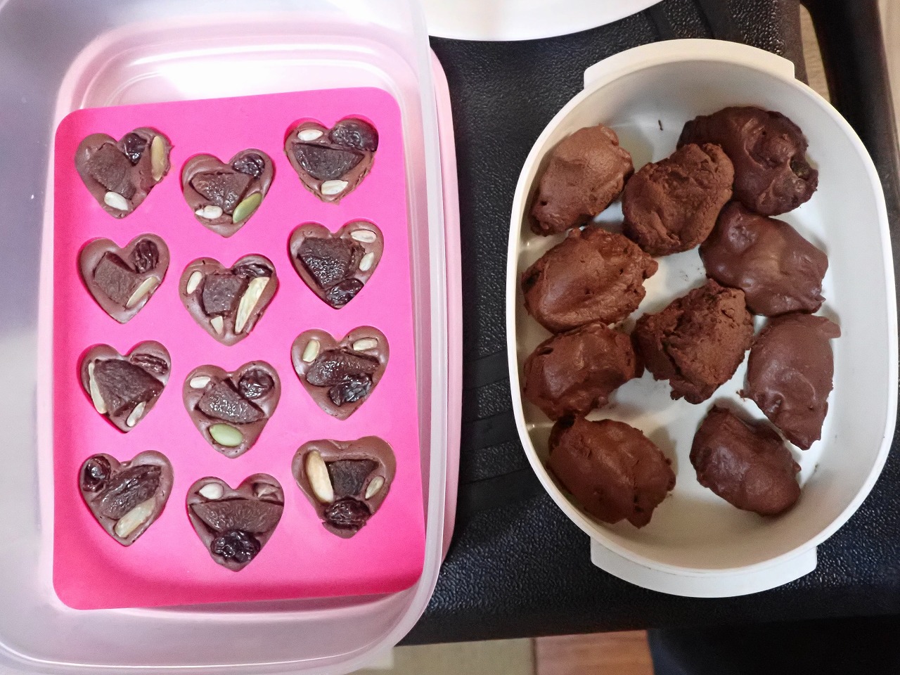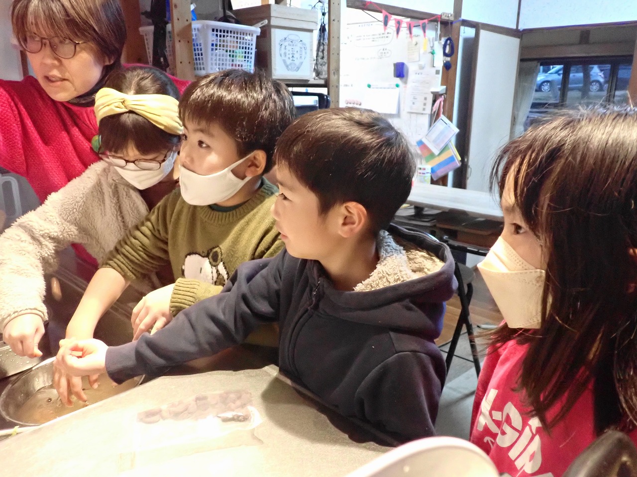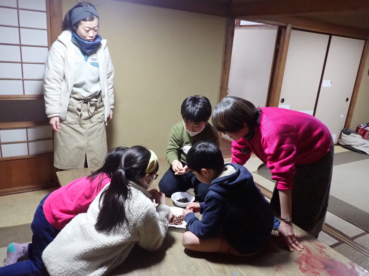 煎りたてのカカオ豆は、砂糖なしのチョコレートの味ですが、「苦い!」「美味しい!」と交互に言いながら、次々と手を伸ばしてきます。デーツに「本物のチョコレート」をまとわせたものや、そのチョコに杏子やナッツを入れた小さなハート型のチョコも、みんなとっても氣に入ってくれた様子。