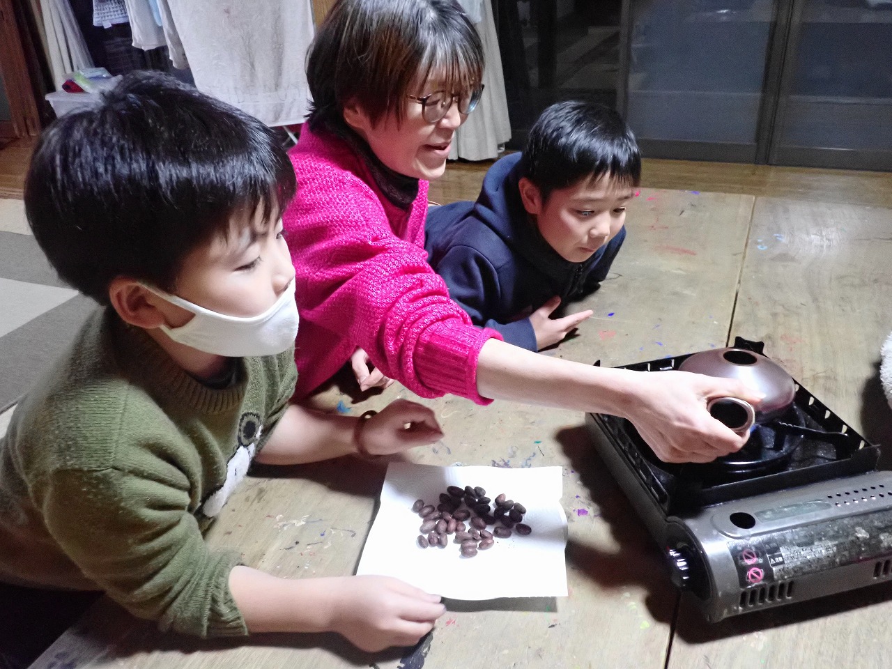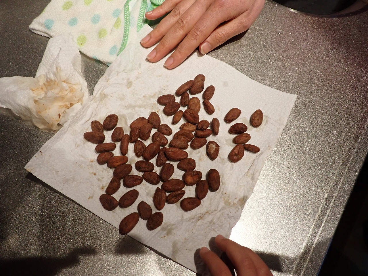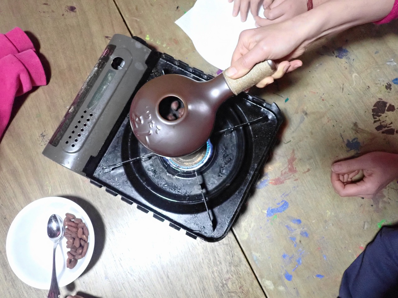 発酵したカカオ豆をぬるま湯で洗うところから始まり、水を切って拭き取ったカカオ豆を、私が持参した焙煎器を使って煎り、皮を剥くところまでみんなに体験してもらいました。