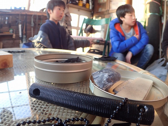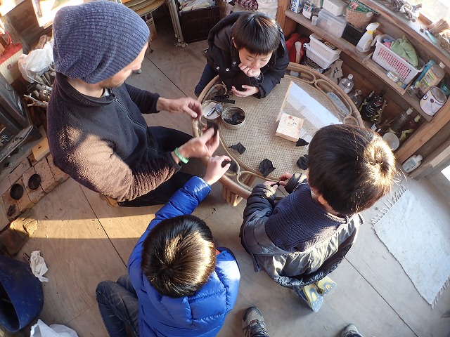 Finally, we melted bees wax into the wood, torched the wood a little to soak in the wax, and then rubbed the wax into the wood to give it a smooth polish. The kids loved the feel of the wood once it was done.