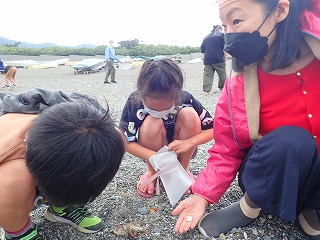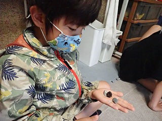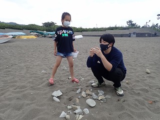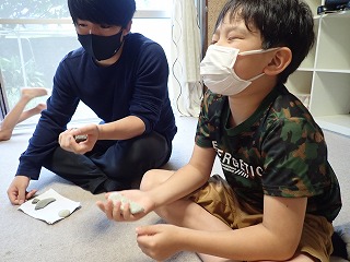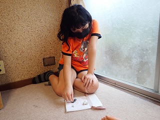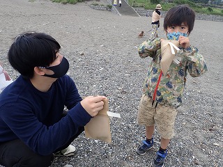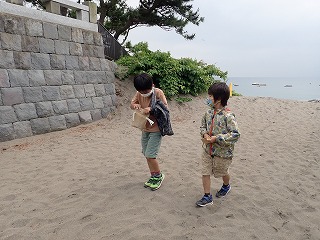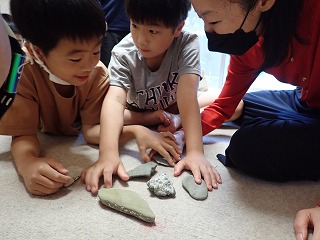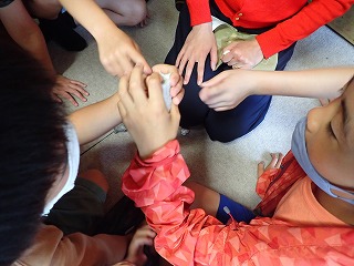 すると、ある女の子はその日に葉山公園で拾ってきたカニに拍手を送りたいと話してくれました。また、ある男の子はかっこいいサメに、他の男の子はいろいろな製品のもととなる鉄に、また、自分自身に拍手を送りたい、と話してくれた女の子もいました。