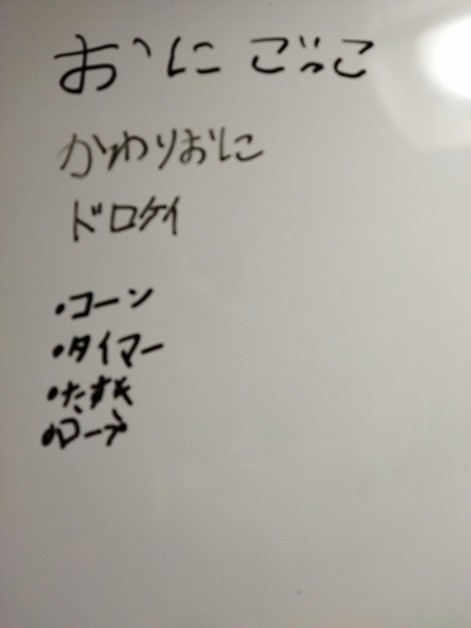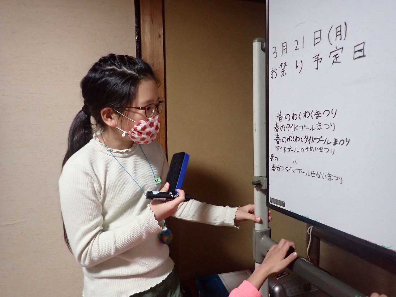 3年生のKちゃんがいつものように、みんなから出てくる案を読みやすい字でホワイトボードに書き出してくれます。