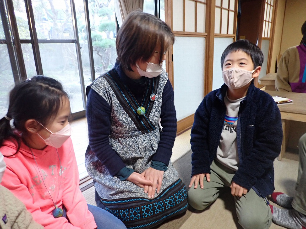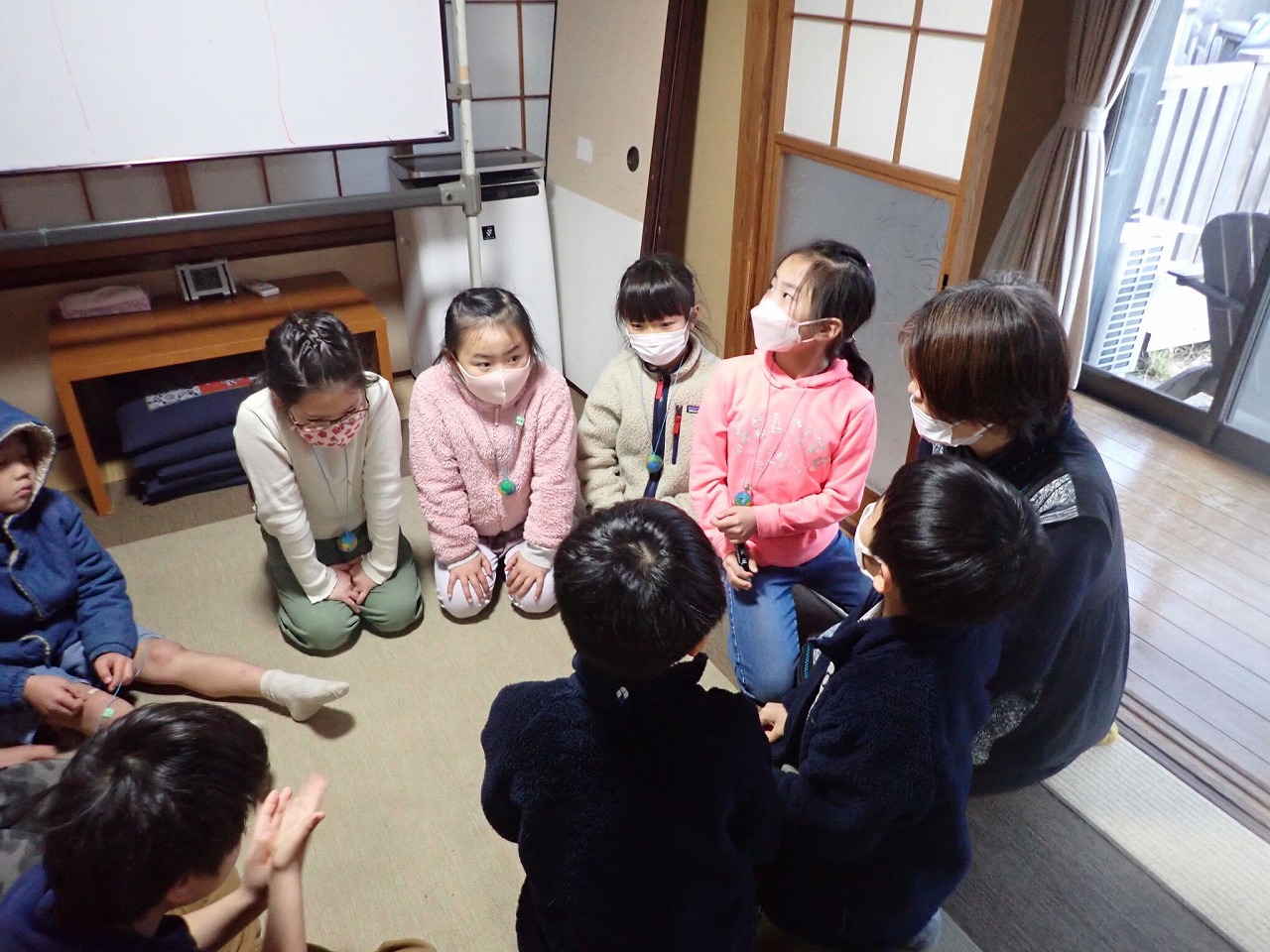 各自、自分が招待したお客さまの受付を済ませ、胸に呼び名の名札を貼った子どもたち&おとなたち計20名以上が、2部屋をつないだタイドプールの和室に集合し、大きな円になって座りました。