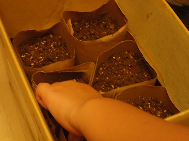 After review, we started our planting of Okra seeds. First, we removed seeds from last year's pods. Then we counted and inventoried our seeds. Next, we created biodegradable pots from craft paper by rolling it out with a jar and folding over the edges.